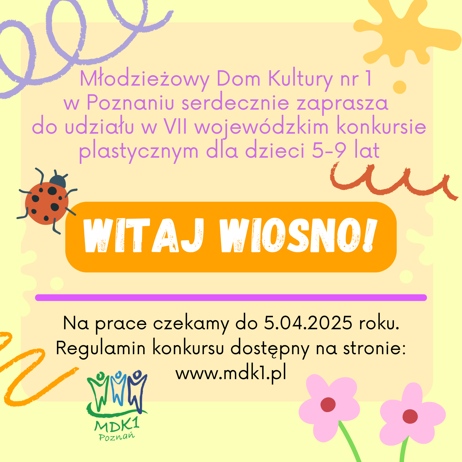 Przywitajmy wiosnę kolorami!Serdecznie zapraszamy do udziału w VII edycji Wojewódzkiego Konkursu Plastycznego ,,Witaj wiosno!"Konkurs skierowany jest do dzieci w wieku 5-9 lat.Na prace, w tematyce odnoszącej się do hasła ,,Witaj wiosno!", czekamy do 5 kwietnia br.Ogłoszenie wyników nastąpi 22 kwietnia w Międzynarodowy Dzień Ziemi!